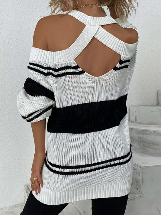 Striped Cutout Cold-Shoulder Tunic Sweater