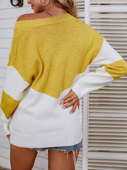 Two-Tone Ribbed Trim V-Neck Sweater