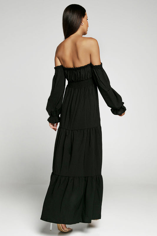 Off-Shoulder Smocked Split Tiered Maxi Dress