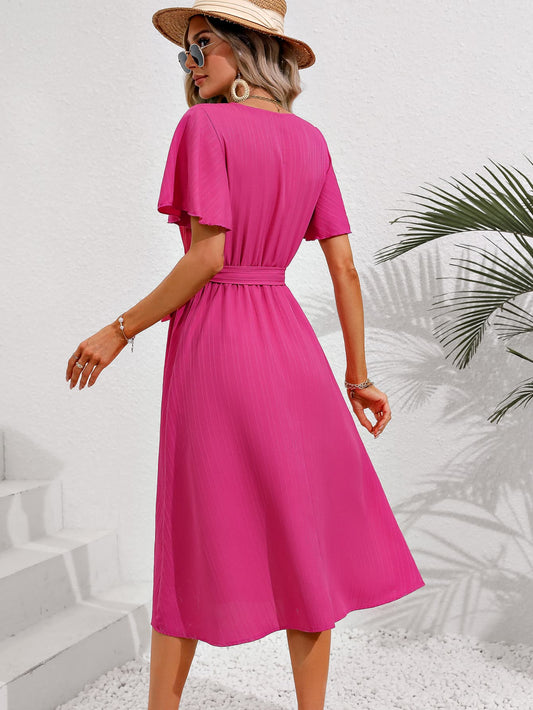 Twist Front V-Neck Flounce Sleeve Dress