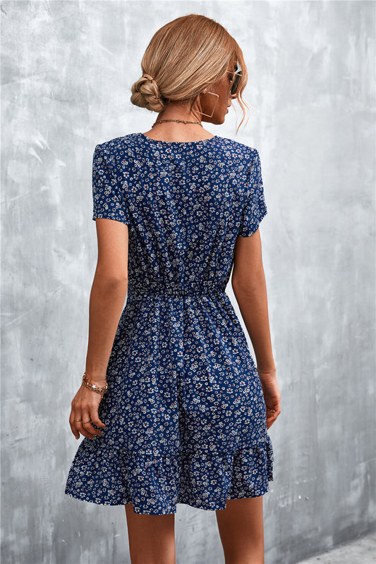 Floral Tie Neck Flounce Sleeve Tiered Dress
