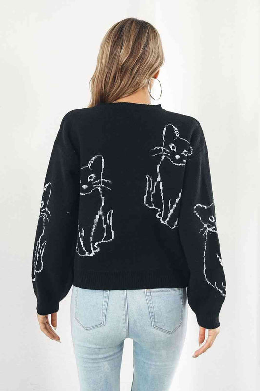 Cat Pattern Round Neck Long Sleeve Pullover Sweater