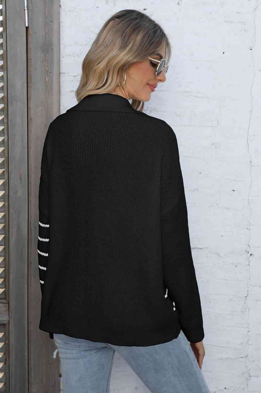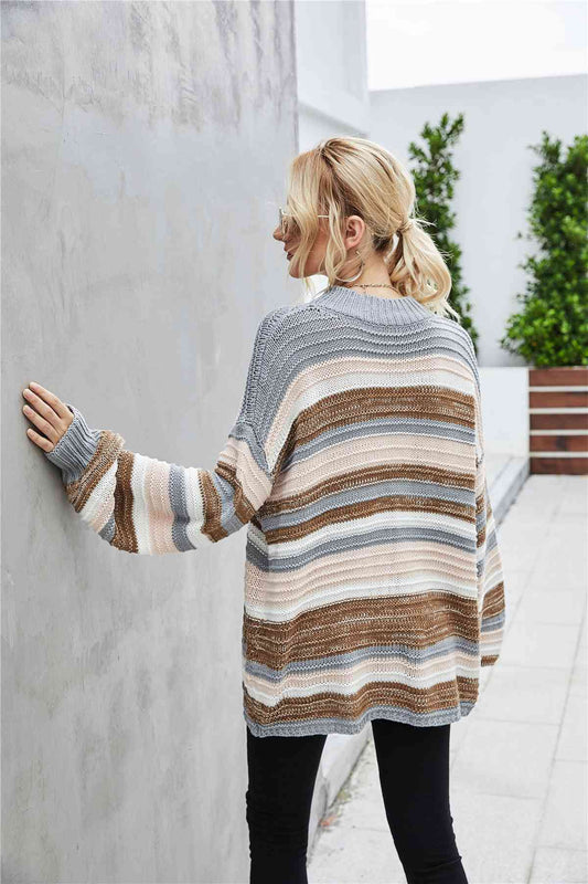 Ribbed Notched Neck Striped Long Sleeve Sweater