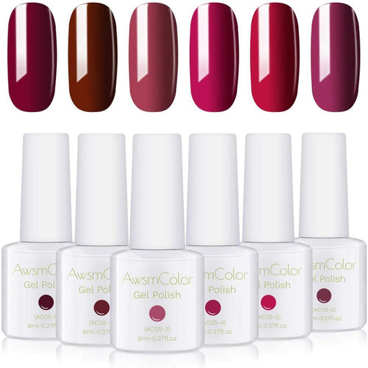 Gel Nail Polish Set, Red Series 6 Colors UV LED Soak Off Nail Gel Kit, Burgundy Ruby Wine Maroon Raspberry Color (N1)(1U85)