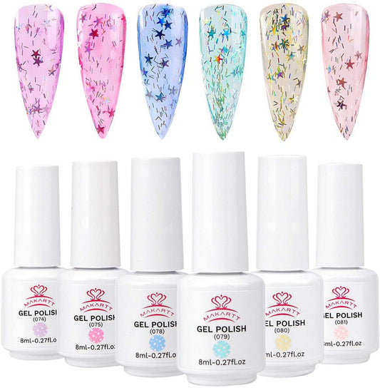 Gel Nail Polish Set, Jelly Glitter Gel Pink Blue Yellow UV LED Nail Polish Kit, Glitter Color Nail Art, 6 Bottles 8ML (N1)(1U85)