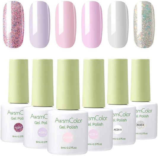 Nail Polish, Gel Nail Polish Set Soak Off Baby Pink White Glitters Nail Polish Kit 6 Colors 8ml UV LED Nail Art Gels (N1)(1U85)