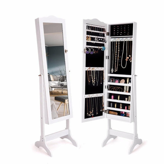 Mirrored Lockable Jewelry Cabinet Armoire Organizer Storage Box w/ Stand White Home Furniture (1FW1)(1U67)