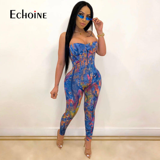 Summer Sexy Club Party Jumpsuits - Women's Strapless Print Halter Backless Rompers - One Piece Outfits (1U33)