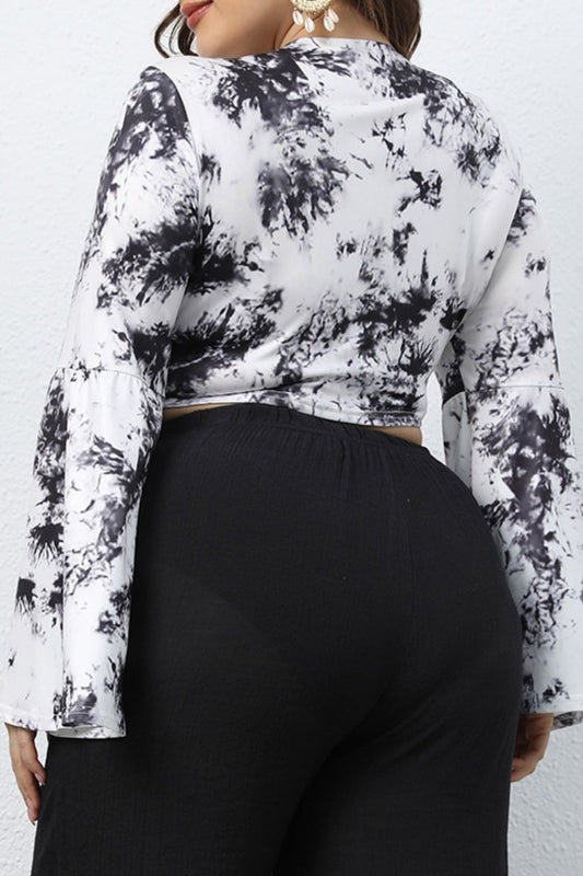 Plus Size Printed Tie Front Flare Sleeve Crop Top