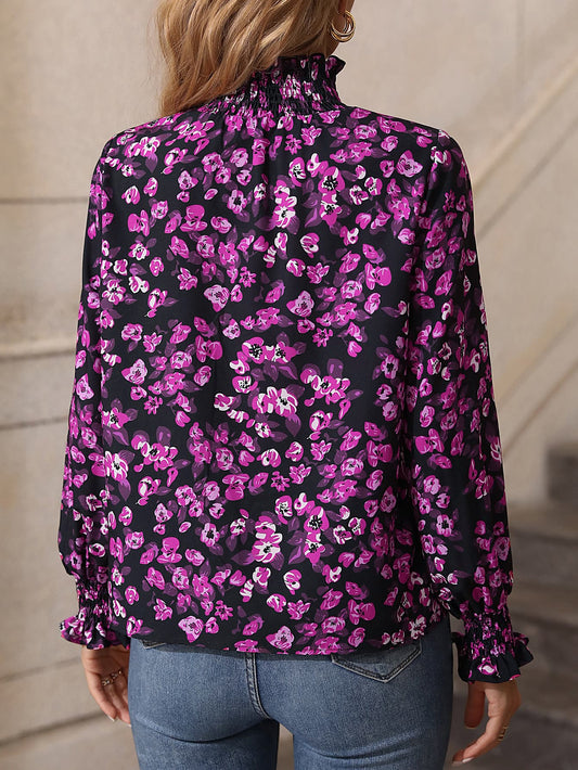 Floral Smocked Ruffle Shoulder Tie Neck Top