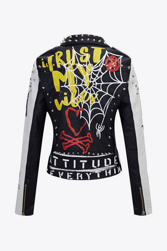 Full Size Printed Zip Up Studded PU Leather Jacket