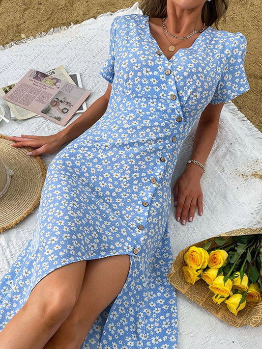 Ditsy Floral Buttoned Puff Sleeve Slit Dress