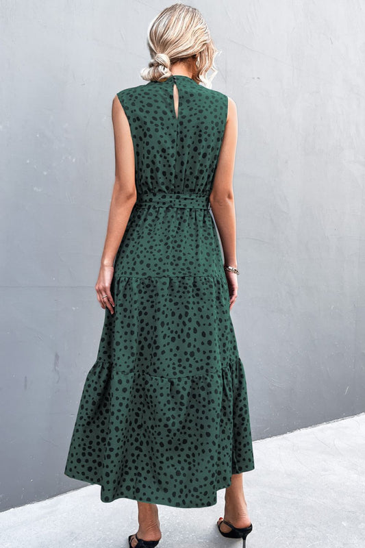Printed Mock Neck Sleeveless Belted Tiered Dress