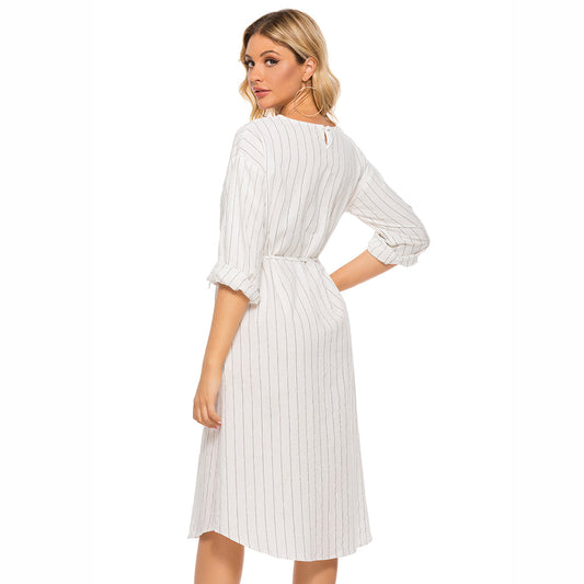 Pinstripe Tie Waist Round Neck Dress