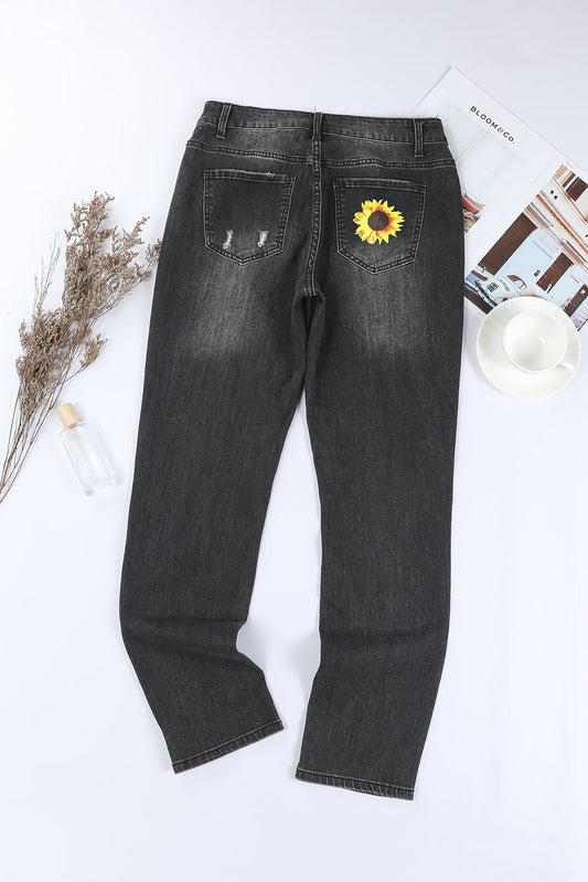Leopard Patchwork Sunflower Print Distressed High Waist Jeans
