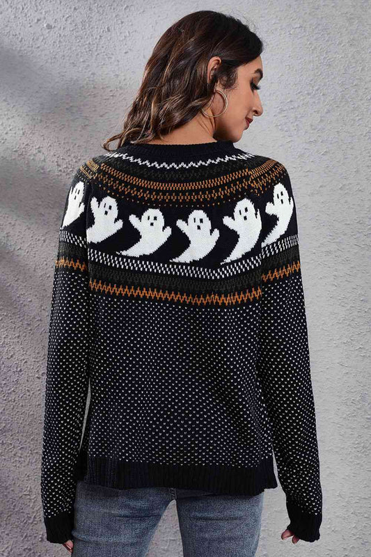 Ghost Pattern Round Neck Long Sleeve Sweater