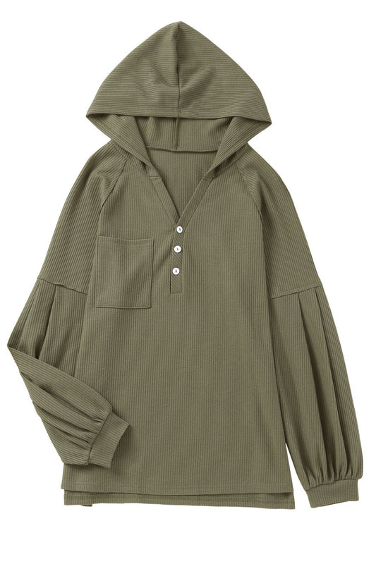 Puff Sleeve Side Slit Buttoned Waffle Knit Hoodie