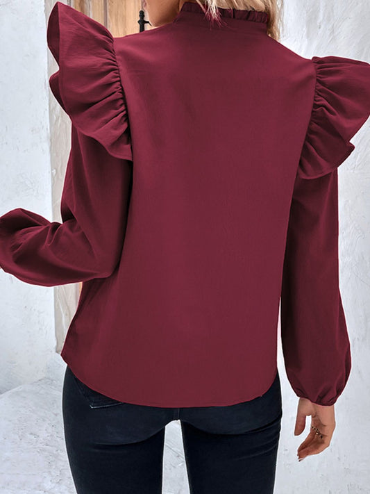 Decorative Button Notched Neck Ruffle Shoulder Blouse