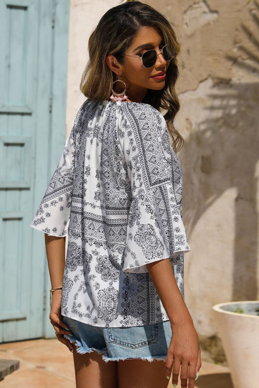 Bohemian Decorative Button Tie-Neck Peplum Blouse