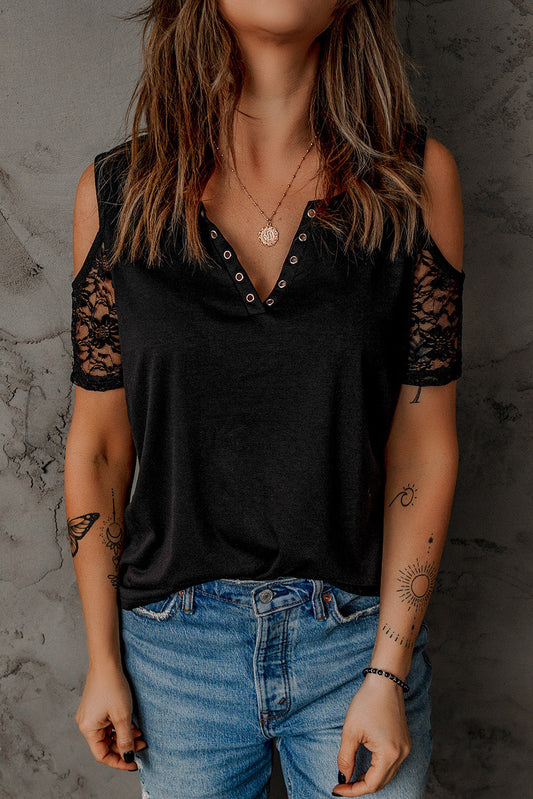 Quarter Snap Spliced Lace Cold-Shoulder Top