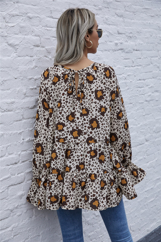 Leopard Round Neck Tiered Flounce Sleeve Blouse
