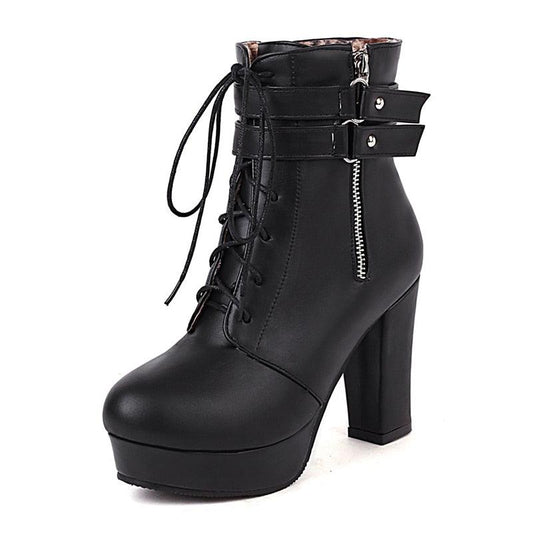 Black Boots Woman Vintage Buckle Casual Lady Boots High Heels Fashion Zipper Sexy Motorcycle Boots (BB2)(CD)(WO4)(BB5)(F38)(3U38)