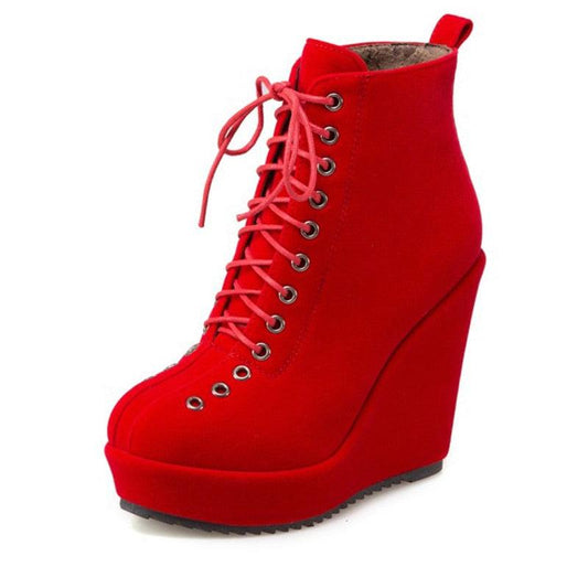 Great Lace Up Platform Women Ankle Boots - Short Winter Shoes Suede Wedge Heels Black Punk (BB2)(CD)(WO4)(BB5)(F38)(3U38)