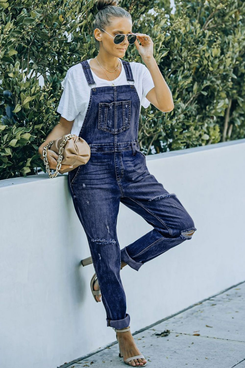 Pocketed Distressed Denim Overalls
